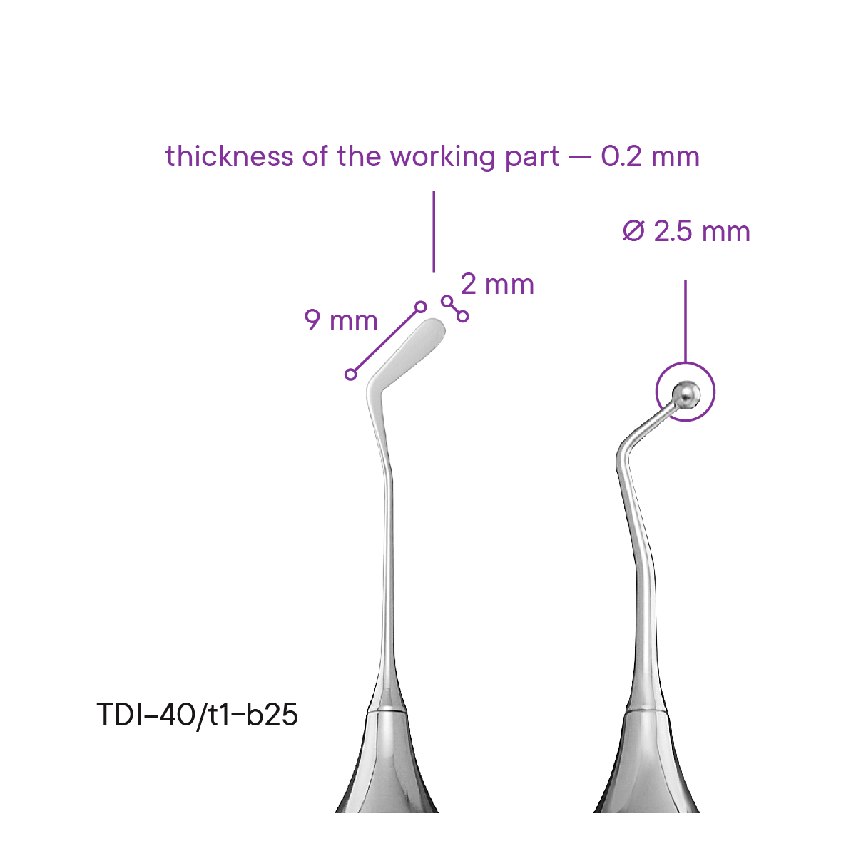 - Nástroj představuje kombinaci nejtenčího hladítka Meddins TDI 40 t1 a štěrkače ve tvaru koule o průměru 2,5 mm.