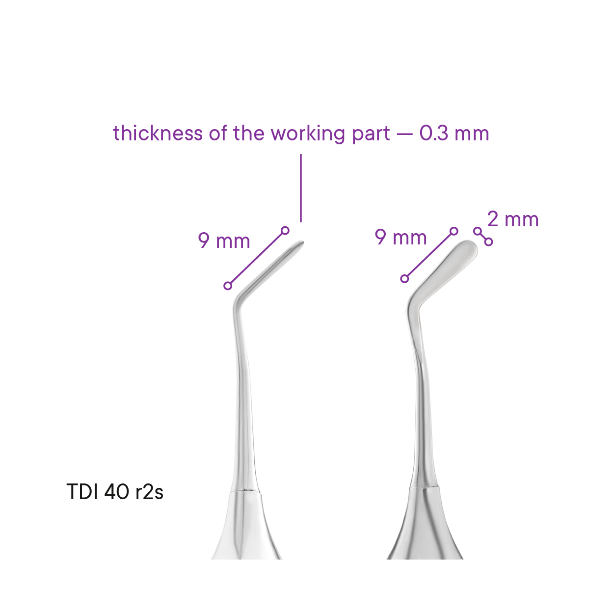 - Zubní hladítko TYPE 2 má dvě v rovině ohnuté pracovní části, které zajišťují přístup do prostor v aproximálních zónách.