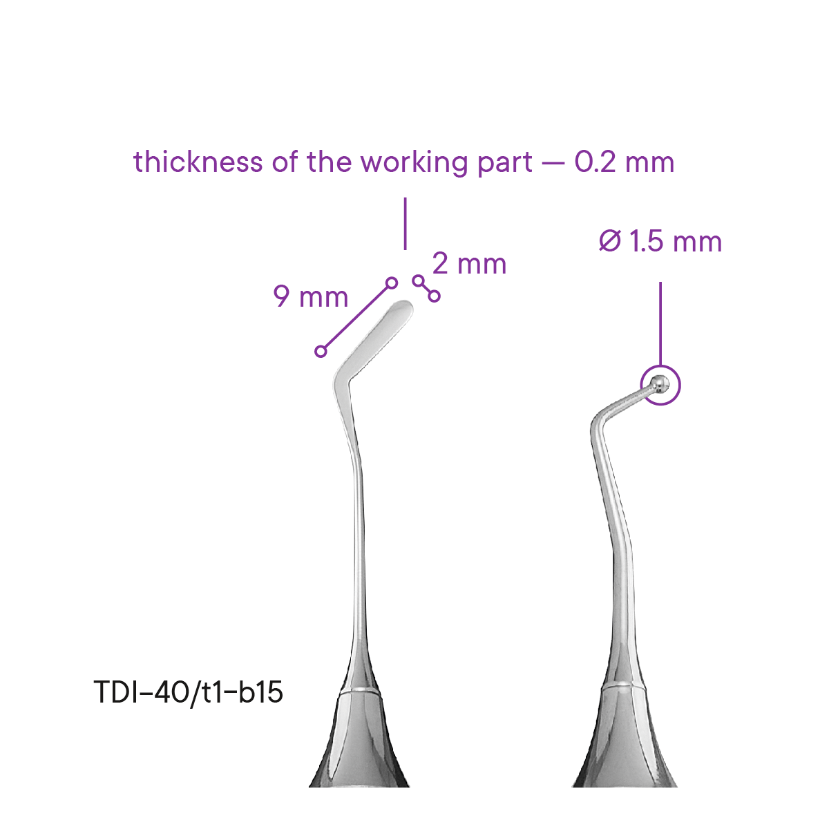 - Nástroj představuje kombinaci nejtenčího hladítka Meddins TDI 40 t1 a štěrkače ve tvaru koule o průměru 1,5 mm.